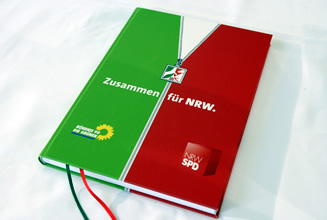 Neben Hannelore Kraft, Vorsitzende der NRWSPD, und Sylvia Löhrmann, Fraktionsvorsitzende der Grünen NRW, unterzeichneten auch alle Mitglieder der Verhandlungsgruppen den 88 Seiten starken Vertrag.