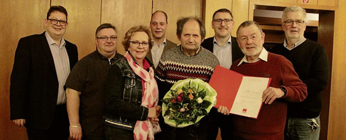Die Ehrung nahm die heimische SPD-Landtagsabgeordnete Angela Lück vor. Zu den Gratulanten gehörten u.a. der heimische SPD-Bundestagsabgeordnete Stefan Schwartze und der SPD-Kandidat fürs Landratsamt Ingo Ellerkamp.