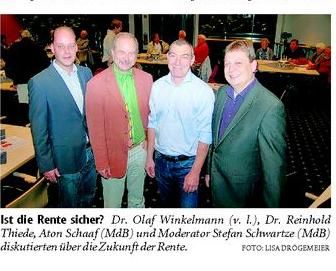 „Es gibt kein Thema, was so im Mittelpunkt steht und umstritten ist, wie die Zukunft der Rente“, eröffnete der SPD-Stadtverbandsvorsitzende Dr. Olaf Winkelmann die Diskussionsrunde, deren Untertitel „Welche Wege gibt es aus dem Rentendilemma?“ lautete. Doch von einem Dilemma der Rente, wollte Anton Schaaf, rentenpolitischer Sprecher der SPD-Bundestagsfraktion, nichts hören. „Die Rente hat kein Dilemma. Der Rentenversicherung geht es ziemlich gut. In Deutschland haben wir das beste Altersvorsorgesystem der Welt“, stellte Schaaf klar. Eine Aussage, der auch Dr. Reinhold Thiede von der Deutschen Rentenversicherung Bund zustimmte. „Eigentlich stehen wir viel zu gut da, ich habe vielmehr Angst, dass bei dem ein oder anderen Begehrlichkeiten aufkommen.“