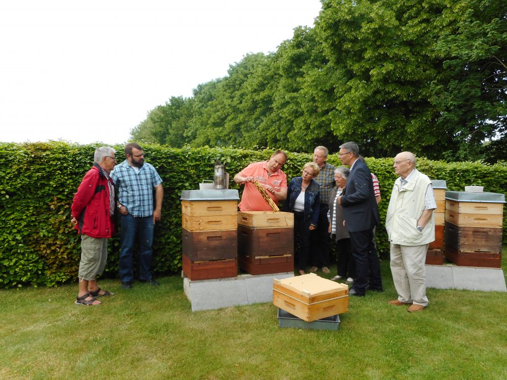 Zum Abschluss hatten die SPD-Politiker Gelegenheit, hautnah die Funktion eines Bienenstocks zu erleben. Hierzu öffnete Flaig einen Bienenstock und holte lecker gefüllte Waben hervor. Zur Hochsaison Ende Juni leben etwa 60.000 Bienen in einem Stock. Sie produzieren im Jahr gut 30 Kilo Honig. „Im Winter wird das Bienenvolk dann auf 15.000 zurück gefahren“ berichtete Flaig.