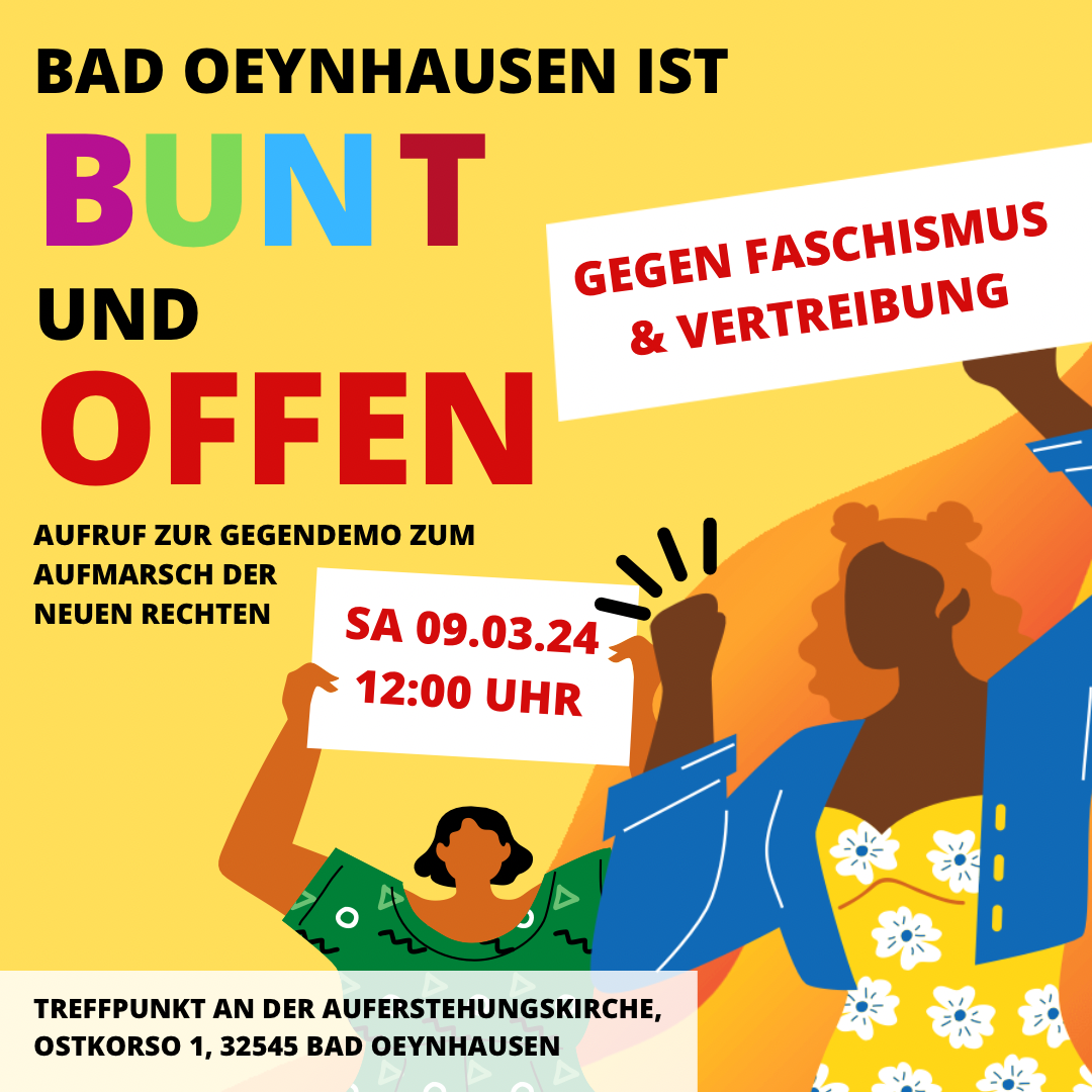 Dieser Aufruf wird unterstützt von zivilgesellschaftlichen Gruppen, Vereinen, Religionsgemeinschaften, Verbänden und Parteien in Bad Oeynhausen, um für ein demokratisches und buntes Bad Oeynhausen einzustehen.