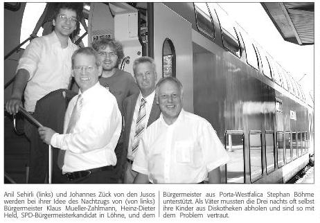 »Mitunter kann da die Sicherheit auf dem Heimweg von der Disco leiden. Gerade Fahranfänger können sich von angetrunkenen Mitfahrern ablenken lassen, damit steigt auf dem Rückweg das Unfallrisiko«, sagte Johannes Zücks, Vertreter der Jusos aus dem Kreis Minden-Lübbecke. »Taxen sind den Jugendlichen oft zu teuer und auch Eltern wollen nachts um drei Uhr nicht mehr ins Auto steigen, um ihre Kinder abzuholen«, fügte Anil Sehirli hinzu. Ein Nachtzug, der von Bielefeld nach Minden fährt, könne diese Probleme beheben, ist sich das Juso-Mitglied aus dem Kreis Herford sicher.