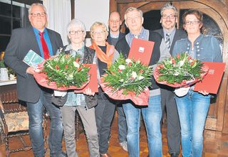 Foto: Michael Körtner (links), Inge Howe (Dritte von links), Dr. Olaf Winkelmann (Vierter von links) und Bürgermeisterkandidat Achim Wilmsmeier (Zweiter von rechts) gratulieren Renate Klinksiek (Zweite von links), Lothar Dräger (Dritter von rechts) und Michaela Backs. Foto: Schuster