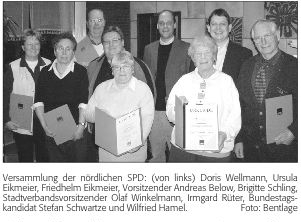 Zugleich stellte sich der Bundestagskandidat Stefan Schwartze aus Vlotho den Parteifreunden vor. Geehrt wurden sechs Mitglieder des Ortsvereins. Friedhelm Eikmeier hält seit 45 Jahren der Partei die Treue. Irmgard Rüter und Wilfried Hamel wurden für 40 Jahre, Ursula Eikmeier für 20 Jahre, Brigitte Schling und Doris Wellmann für 10 Jahre Mitgliedschaft in der SPD ausgezeichnet.