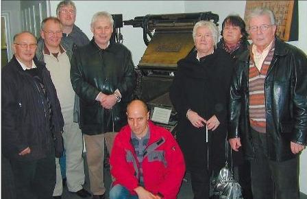 Unser Foto zeigt die SPD-Mitglieder (von links) vor der historischen Bleisetzmaschine, Baujahr 1926: Friedhelm Schäfer, Hans-Gerd Vogel, Karl Heimann, Günter Seele, Gerd Krömker, Christiane Schildan sowie Dorelies und Erich Tschamann.