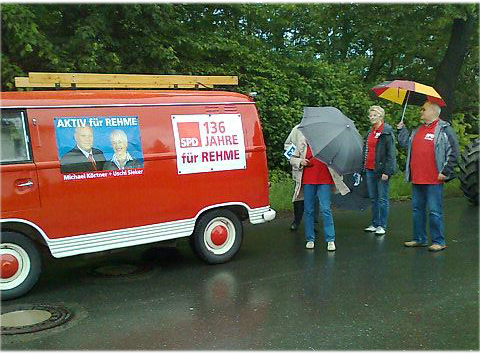 Am Umzug beteiligte sich auch der SPD Ortsverein, der in diesem Jahr 136 Jahr besteht. Ein Oldtimer Feuerwehrauto, Ford Transit, 50 Jahre alt, beschriftet und bebildert mit den Ratsmitgliedern der Stadt Bad Oeynhausen, Ursula Sieker und Michael Körtner war dazu das richtige Einsatzfahrzeug. Begleitet wurde der Oldtimer während des Umzugs vom harten Kern der SPD Mitglieder, die sich auch vom Regen nicht abhalten ließen. Es war erstaunlich, dass trotz des miserabelen Wetters viele Zuschauer an der Route des Umzugs standen.