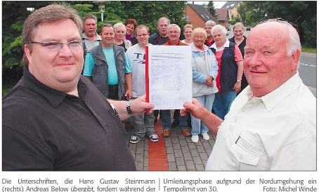 Bad Oeynhausen-Bergkirchen (win). Kinderspielplatz, Gemeindehaus, Arztpraxis - an der Bergkirchener Straße ist jetzt schon viel Verkehr. Während des Nordumgehungsbaus soll für weitere sieben Monate Verkehr von der Eidinghausener Straße durch den Oeynhausener Norden geleitet werden. Das akzeptieren die Anwohner zwar, wollen die Situation aber etwas entschärfen. Deshalb überreichten sie Mittwoch einen Antrag mit 25 Unterschriften von Anwohnern der Bergkirchener und Randstraßen an Andreas Below. Der Vorsitzende des SPD Ortsvereins will einen Antrag formulieren und schließlich in die Fraktion einbringen.