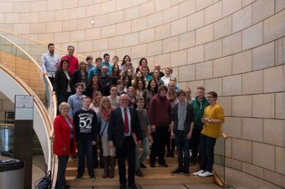 49 CyberCops und Medienscouts mit einigen Lehrerinnen und Lehrern waren im nordrhein-westfälischen Landtag und fühlten dem Medienpolitiker Ernst-Wilhelm Rahe (SPD) auf den Zahn: „Den Anstoß zu dieser gemeinsamen Exkursion gaben die von der Landesanstalt für Medien (LfM) NRW zu Medienscouts ausgebildeten Schüler der Gesamtschule Hüllhorst. Sie wünschten sich beim Besuch von Rahe am Tag der Medienkompetenz, auch andere Medienscouts aus dem Kreis kennenzulernen, sich mit ihnen auszutauschen und mehr Informationen von der LfM zu bekommen!“, so Rahe.