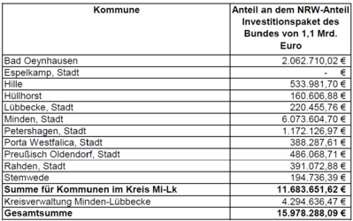 Mit 15.978.288,09 Euro profitieren die Kommunen im Kreis Minden-Lübbecke vom neu aufgelegten Investitionsförderungsfonds des Bundes. Das geht aus dem Ausführungsgesetz hervor, über das der Landtag NRW am Mittwoch dieser Woche entschieden hat. Die heimischen SPD-Abgeordneten Inge Howe (MdL), Ernst-Wilhelm Rahe (MdL) und Achim Post (MdB):