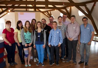 Bild: Vanessa Pohl (links), Jan-Philipp Schnier (rechts) und Tim Nolte (Mitte vorne) vom Projektteam „5 unter 25“ begrüßen die TeilnehmerInnen zum Projektstart.