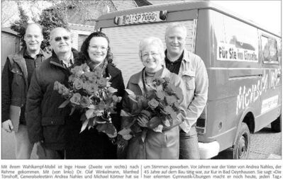 »Das ist eine Wertschätzung aus Berlin für Inge Howe.« SPD-Stadtverbandschef Dr. Olaf Winkelmann freute sich über den prominenten Gast im Wahlkampf an der Basis. Arminiusweg 1, von dort aus machten sich die Sozialdemokraten auf den Weg zu ihren Hausbesuchen. Dort wohnt der Rehmer Vereinsring-Vorsitzende Frank Helming, zugleich stellvertretender Schriftführer des Rehmer SPD-Ortsvereins. Inge Howe: »Je nachdem, wie lange die einzelnen Gespräche dauern, kann man sich in 20 Haushalten vorstellen.«