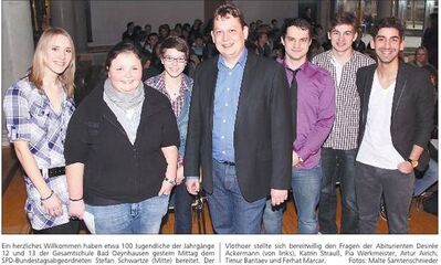 Bad Oeynhausen (WB). Ein offenes Ohr für die Anliegen junger Menschen hat der Bundestagsabgeordnete Stefan Schwartze (SPD) gestern bei zwei Diskussionsrunden gezeigt. Erst stellte er sich den Fragen der Abschlussstufe der Schule am Weserbogen. Dann folgte ein lebhafter Gedankenaustausch mit Oberstufenschülern der Gesamtschule.