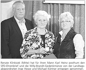 Bad Oeynhausen-Rehme (mas). »Er war sehr zuverlässig und immer da, wenn man ihn gebraucht hat«, sagt die SPD-Landtagsabgeordnete Inge Howe über ihren Parteigenossen Karl Heinz Klinksiek. Ihm ist am Montagabend posthum der Ehrenbrief der Partei, die Willy-Brandt-Gedenkmünze und die Ehrenmitgliedschaft im SPD-Ortsverein Rehme verliehen worden.
