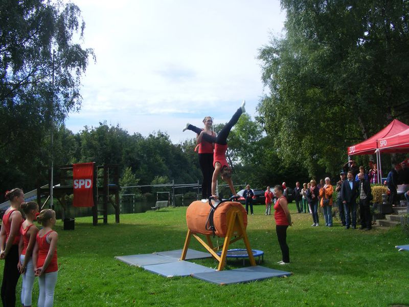 Bad Oeynhausen. Hoch hinaus ging es für das Quartett Hanna, Marleen, Mara und Giona. Die vier Nachwuchstalente der Reit- und Voltigiergemeinschaft präsentierten dem Publikum beim Sommerfest der örtlichen SPD-Ortsvereine eine atemberaubende Show. Aber auch zwei andere Voltigiergruppen gaben ihr Können zum Besten.